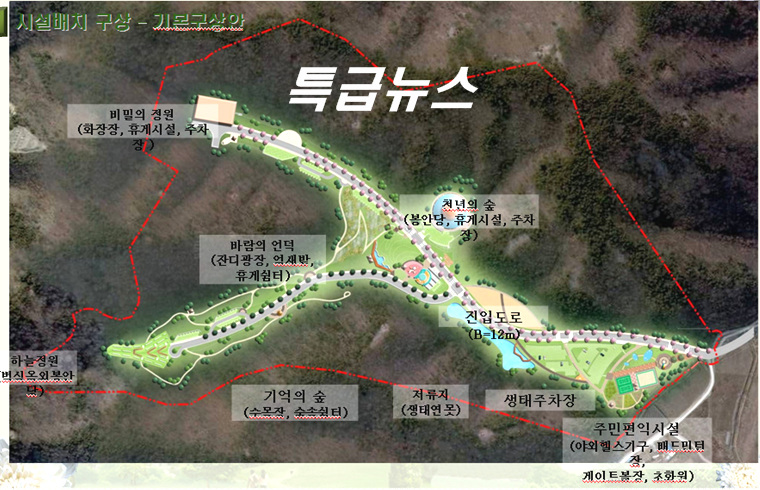 그리고 ‘천년의 숲’으로 이름 붙여진 3,000㎡ 규모의 봉안당(납골당)과 벽식 옥외봉안 시설인 ‘하늘 정원’, 3만 6,000㎡ 규모의 자연장(수목장) 시설인 ‘기억의 숲’, 피크닉장 및 계류장, 쉼터 및 편의시설, 관리사무소 등이 화장장 아래쪽에 배치될 계획이다.