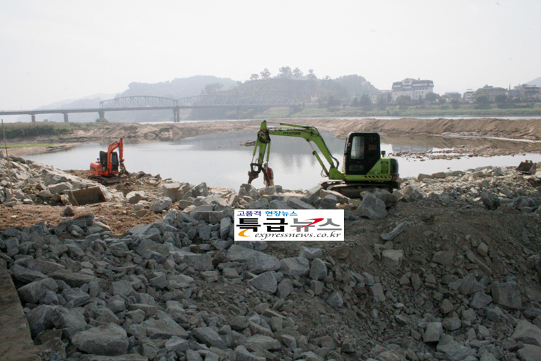 | ▲ 지난 7월 집중호우로 유실된 30여 미터의 백제큰다리 교각보호공사가 한창 진행중에 있다. |