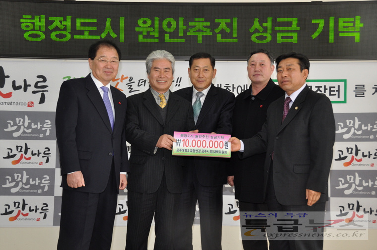 공주대학교 교명변경 저지 공주시범대책위원회(수석대표 정재욱)는 행정도시 범 공주시민대책위원회(공동대표 정만수, 이충열, 이하 '범대위')에 성금 1천만원을 기탁했다.