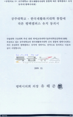 한편, 공주대와 재활복지대는 지난해 12월 29일 교육과학기술부에 국립대학통합 승인신청서를 공동으로 제출하면서 그 말미에 평택시와 평택시의회의 의견을 첨부했다.