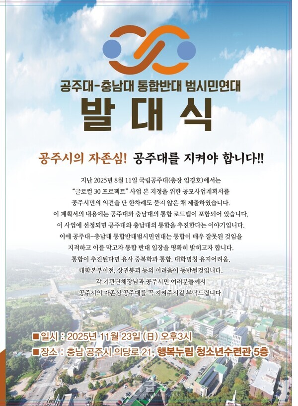 공주시 이통장연합회를 비롯한 100여 개의 공주지역사회단체로 구성된 ‘공주대-충남대 통합반대 범시민연대(위원장 윤경태)’는 11월 23일 오후 3시 공주시 의당로 행복누림 청소년수련관 5층에서 발대식을 열고, 공주의 정체성과 자존심, 생존권을 지키기 위한 본격적인 활동에 돌입할 예정이다.