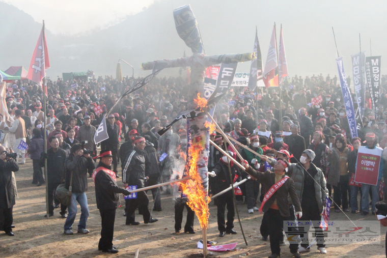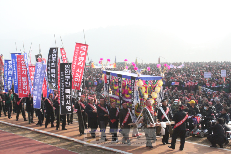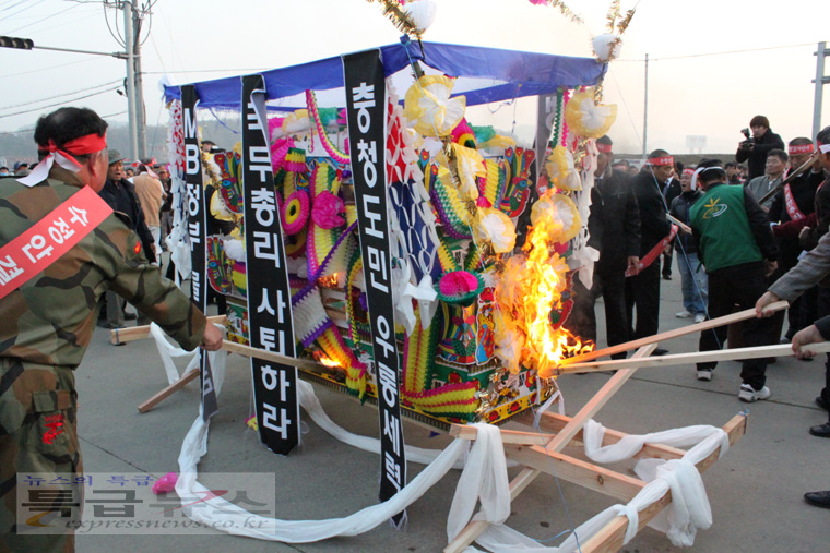 ![]() 행정중심복합도시(세종시) 전면 백지화 움직임이 본격화되면서 충청인들의 분노가 폭발 일보 직전으로까지 치닫고 있는 가운데 공주·연기지역 주민들이 ‘세종시 원안추진’을 위해 결사투쟁을 선언하고 나섰다. 공주·연기 주민 1만여명은 26일 오후 1시 30분 공주시 금강둔치공원에서 모여 정부의 세종시 백지화 움직임에 대해 ”거짓말 정권, 사기꾼 정부”라고 규탄했다. 이들은 이날 ‘세종시 원안사수’라고 적힌 머리띠와 ‘세종시 수정안 결사반대’, ‘정운찬 총리는 사죄하라’, ‘MB정부 물러가라’, ‘충청도민 우롱말라’ 등의 문구가 적힌 피켓 등을 들고 정부를 집중 성토했다. 행정도시 범 공주시민대책위원회(공동대표 이충열, 정만수. 이하 범대위)가 주관한 이날 행사에서 공주·연기지역 주민들은 한목소리로 “이제 더 이상 못 참겠다”며 “세종시 수정계획을 즉각 중단하지 않으면 엄청난 저항에 부딪힐 것”이라고 경고했다. 먼저 정만수 범대위 공동대표는 투쟁선언에서 "MB정부는 사기꾼 정부“라고 맹비난하고, ”우리의 뜻이 관철될 때까지 끝까지 투쟁해 나가겠다“고 천명했다. 이충열 공동대표 또한 “정부를 믿고, 우리지역 출신인 정운찬 총리를 믿었는데 충청인을 우롱하고 고향주민들에 비수를 들이대고 있다”면서 “세종시를 백지화하려는 정부와 불순한 정치세력은 역사의 준엄한 심판을 받게 될 것”이라고 경고했다. ![]() 이준원 공주시장은 “국가를 위한다기에 살던 터전까지 내주고 7년을 기다렸는데 이제 와서는 지역이기주의자로 땅 투기꾼으로 몰고 있다”면서 “기업 몇 개, 학교 몇 개 먹고 떨어지라는 식으로는 곤란하다”고 목소리를 높였다. 이 시장은 이어 “법으로 정한 국책사업을 뒤집는 것은 법 위에 군림하려는 것이며, 대한민국을 부정하는 행위로 역사의 거울 앞에 부끄러운 줄 알라”며 “이명박 대통령은 내일 TV토론에서 국민 앞에 사죄하고 원안추진을 약속하지 않는다면 국민적 저항을 책임져야 할 것”이라고 말했다. 김태룡 공주시의회 의장은 “만일 세종시가 무너진다면 국가균형발전은 영원히 물 건너가게 될 것”이라며 우려를 표한 뒤 “엉뚱한 논리를 내세워 어설픈 세종시 수정안을 내놓는다면 엄청난 후폭풍을 각오해야 할 것”이라고 말했다. 이어 심대평 국회의원은 “이름은 그대로 두고 성을 바꾸겠다는데, 행정중심복합도시의 '성'인 '행정중심'을 바꾸겠다는데 절대 동의할 수 없고, 행정기관이 오면 유령도시가 된다는데, 그거 해보기나 했냐? 안 해봤으면 얘기를 말라”면서 “계백장군의 5천결사대의 비장한 각오와 정신으로 세종시를 지켜내자”고 역설했다. 또 이명박 대통령의 TV토론과 관련, “진정성을 가지고, 고해성사의 심정으로 국민과의 대화에 임해야 하며, 만일 감언이설로 국민을 속이려 한다면 결코 용서치 않을 것”이라고 고언했다. 유한식 연기군수는 “세종시 원안추진은 MB가 12번이나 약속한 사항으로 법대로만, 약속대로만 하면 된다”면서 “상생과 화합으로 가느냐, 갈등과 고통의 나락으로 떨어지느냐의 갈림길에 서 있는 만큼 힘은 한데 모아 싸워 나가자”고 강조했다. ![]() 이성규(세종시 주변지역 공주시대책위원장)·송영월(공주여성단체협의회 부회장)씨의 결의문 낭독을 끝으로 금강둔치에서의 집회를 마친 이들은 약 1,000여대의 차량을 이끌고 연기군 금남면 행정중심복합도시건설청까지 약 20km구간에서 차량 이동시위를 벌였다. 집회 참석자들은 이어 꽃상여와 만장 100여개를 앞세우고 “행정도시 원안사수”를 외치며 건설청으로 진입하려다 경찰과 몸싸움을 벌이기도 했다. 경찰은 이날 성난 지역주민들의 건설청 진입을 막기 위해 경찰병력 30개 중대와 물대포를 배치하고 경찰버스로 차단벽을 만들었다. 다행히 큰 충돌은 없었지만, 건설청장과의 면담 및 건설청으로의 진입에 실패한 주민들은 ‘원안추진 촉구문’과 ‘연대선언문’을 낭독하고, 꽃상여와 허수아비 등을 불태우는 퍼포먼스를 연출한 뒤 오후 5시쯤 자진 해산했다. 한편, 이날 오전 전국 13개 광역의회 의장단 모임인 지역균형발전 광역의회협의회와 16개 혁신·기업도시의 시·군 의장단은 충남도의회에서 ’세종시 및 공공기관 지방이전 원안추진 촉구대회‘를 열고 “세종시 건설은 혁신도시와 기업도시를 이끄는 국토균형발전의 핵심“이라며 충청권과의 연대투쟁을 선언했다. 이들은 이날 “중앙부처가 이전하지 않으면 공공기관의 지방 이전도 물거품이 될 것”이라며 ”정부가 세종시 수정안을 강행한다면 2,500만 지방민의 강력한 저항을 받게 될 것“이라고 엄중 경고했다. |