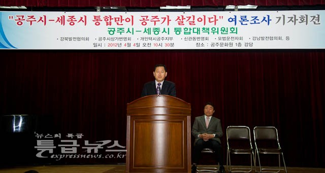 공주시-세종시 통합 대책위원회(위원장 안도성 공주시 상가번영회장)는 4일 오전 10시 30분 공주문화원에서 공주시와 세종시의 통합관련 여론조사결과를 발표했다.