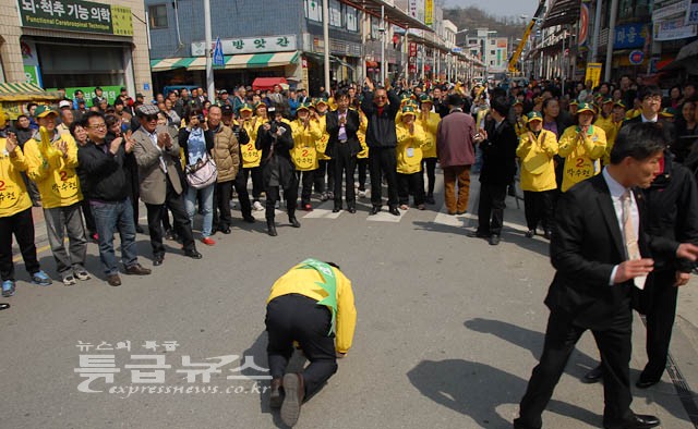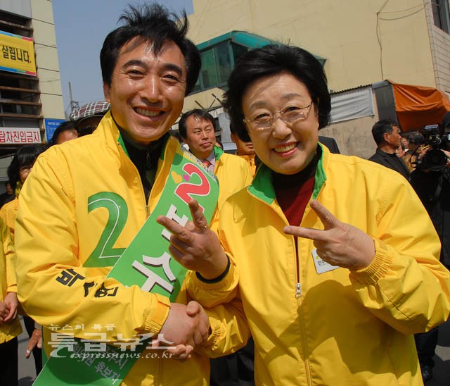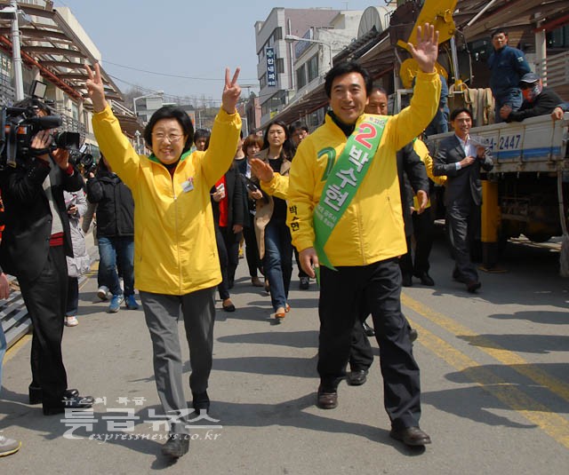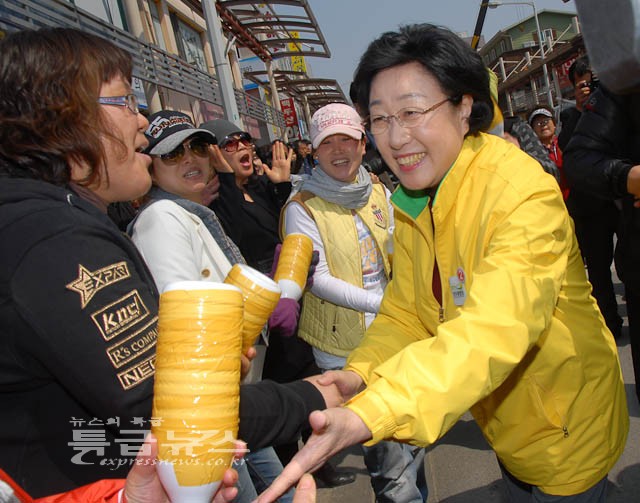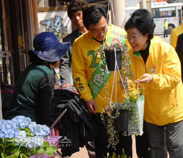 한명숙 민주통합당 대표가 4일 오후 산성시장을 방문해 박수현 후보 지원유세를 펼쳤다.