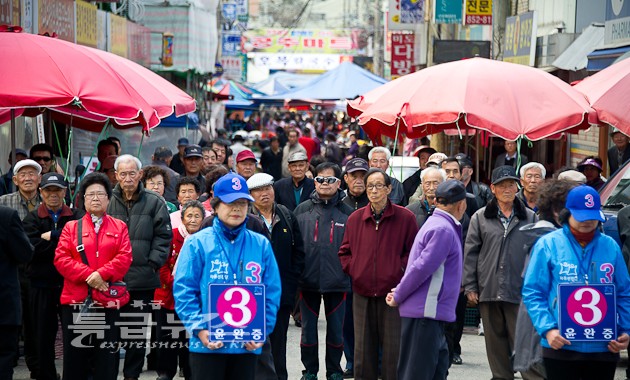 윤완중 후보는 이날 지지연설을 마치고 산성 시장을 찾아준 지지자들과 시민, 상인들과 인사와 악수를 나누며 지지와 호소를 부탁했다.