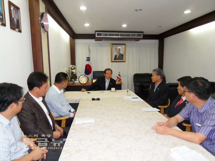 이날 일행들은 (사)재태국 한인회 김형곤 회장과 최철순 수석부회장, 황승철 사무국장과 자매결연을 위한 협조사항에 대해 간담회를 갖고 공주시의회에서 준비한 선물과 태권도 티셔츠, 의류를 전달해 따뜻한 마음을 전했다.