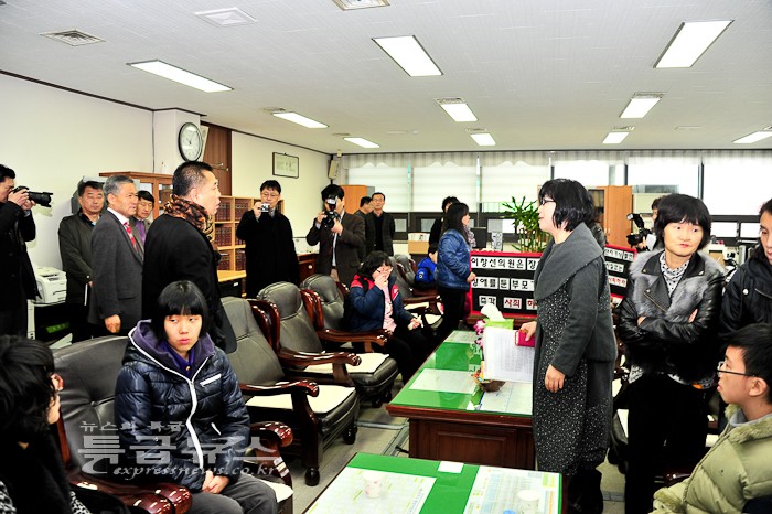 충남장애인부모회 공주지회 가족 30여명은 3일 오전 9시 40분 공주시의회 행정사무감사장을 항의 방문, 행정사무감사 특별위원회실 앞에서 기자회견을 열었다.