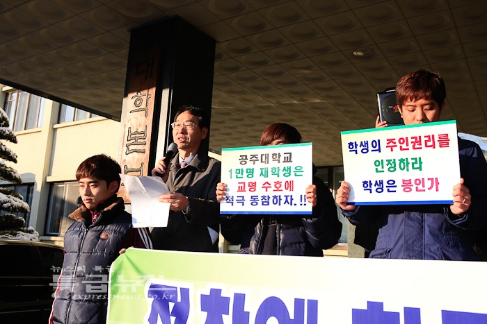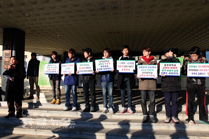 이들은 6일 오후 3시 30분 공주대 대학본부 앞에 모여 “공주대 대학본부가 학적 당사자들의 의견을 철저히 무시했다”며 교명을 변경하려는 대학본부를 규탄, 교명변경을 저지하기 위한 궐기대회를 개최했다.